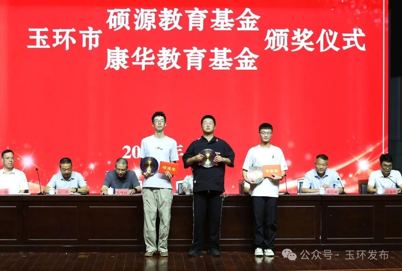 与会领导和嘉宾向2025年玉环高考优秀学生代表表示祝贺,并向考上清华大学的鲁洪轩、陈宣鋆、吴昊三位同学颁发浙江硕源教育基金会“英才奖”。